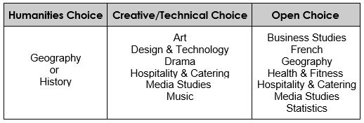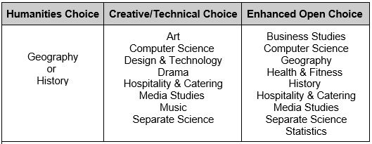 You are likely to feel that you have made strong progress in most subjects, although you may feel less confident in Modern Foreign Languages. French is not a compulsory subject within this pathway; however, students who wish to continue their study of French may select it within the Open Choice column.